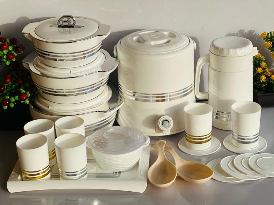 20 sets of complete dinner set comprising of cups, tray, cups cover, spoons, jug and 3 insulated dinner plateis also known as WARMER PLATE. It keeps the food HOT till when needed. No need to RE-HEAT the food before eating. It keeps the original taste of the food, avoiding going into fire severally .It is a long lasting PRODUCT that doesn't spoil easily. It's durability is assured .Highly PRESENTABLE AND PRESTIGIOUS to behold and use. It is made of thick plastic cover,, that is what holds the hotness of the FOOD till when needed