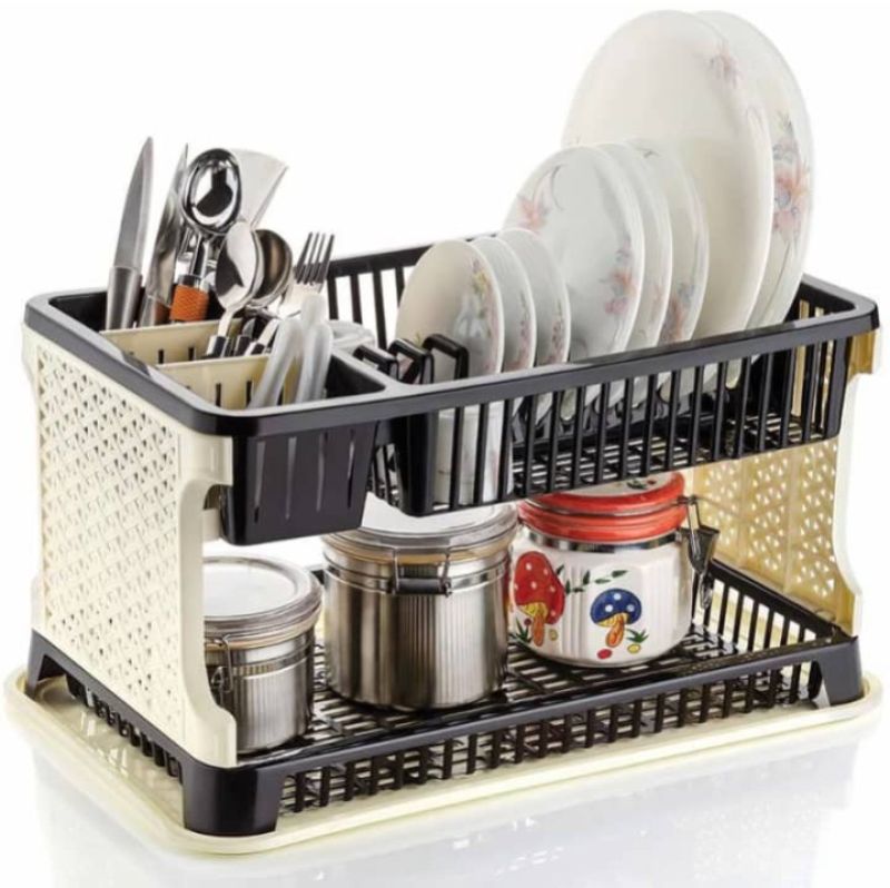 Plastic Kitchen Organizer Rack with Water Storing Tray, 2 Layer Fordable Kitchen Dish Drainer Organizer Storage Stand