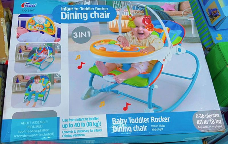 Appropriate for Newborn babies (Can Be Extended as The Baby Grows). Calming vibrations and 12 rhymes soothe the baby like a ride in the car Reposition seat closer to toy bar for interactive play. Birdie plug-in toy sits within baby's reach, detaches for take-along play. Baby bats at the hanging toy to activate fun music. Toy bar swings away for naptime removable toy bar. Frame extends to higher position for toddler rocker or stationary seat. Folds away compactly for carrying it around Ages 6 months to 36 months. Maximum weight 20 kgs. Requires 3 AA batteries ( Not Included) Two overhead toys which encourages interactive play. Machine-washable dryer safe seat pad. 2 Positions reclining seat. Front assemble plate for baby feeding