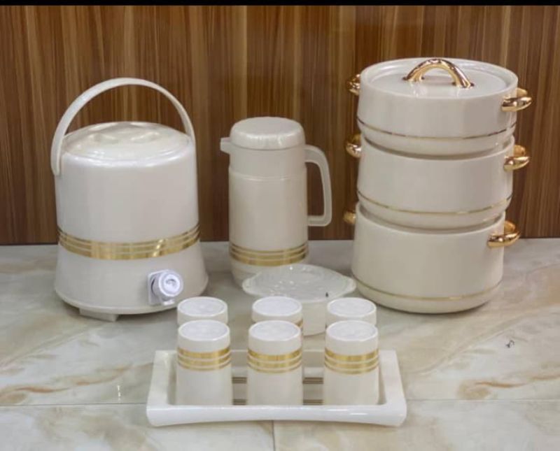 20 sets of complete dinner set comprising of cups, tray, cups cover, spoons, jug and 3 insulated dinner plateis also known as WARMER PLATE. It keeps the food HOT till when needed. No need to RE-HEAT the food before eating. It keeps the original taste of the food, avoiding going into fire severally .It is a long lasting PRODUCT that doesn't spoil easily. It's durability is assured .Highly PRESENTABLE AND PRESTIGIOUS to behold and use. It is made of thick plastic cover,, that is what holds the hotness of the FOOD till when needed. These set of PLATE. It is also known as WARMER PLATE .It keeps the food HOT till when needed. No need to RE-HEAT the food before eating. It keeps the original taste of the food, avoiding going into fire severally. It is a long lasting PRODUCT that doesn't spoil easily. It's durability is assured. Highly PRESENTABLE AND PRESTIGIOUS to behold and use. It is made of thick plastic cover that is what holds the hotness of the FOOD till when needed.